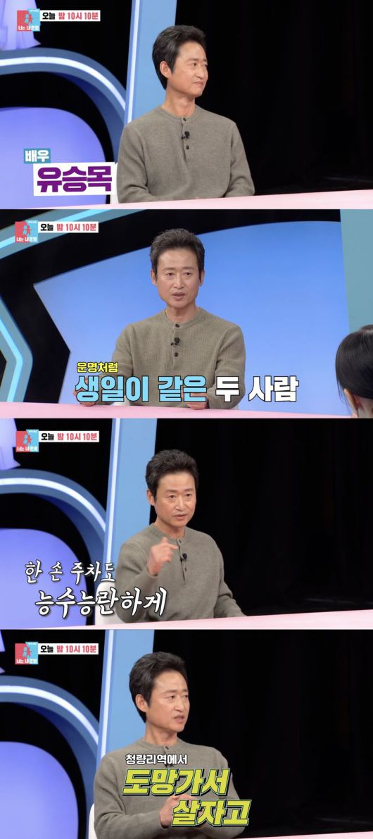 유승목은 "영화 '살인의 추억'(2023) 오디션을 보러 갔는데 봉준호 감독이 자기랑 생일이 똑같다고 했다"며 "나중에 보니 생년월일이 다 똑같더라"라고 한다.