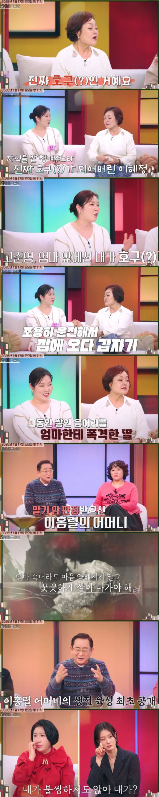 뿐만 아니라 이홍렬은 말기 암 판정을 받으신 어머니를 떠올렸다. 이홍렬은 "어머니가 유언 같은 걸 많이 해주셨다"면서 '엄마 죽더라도 마음 약해지지 말고 꿋꿋하게 살아 나가야 해'라며 어머니의 생전 육성을 최초 공개했다. 어머니의 이 같은 말에 이홍렬은 "내가 불쌍하지도 않아?"라며 눈물을 흘려 보는 이들까지 뭉클함을 안겼다.