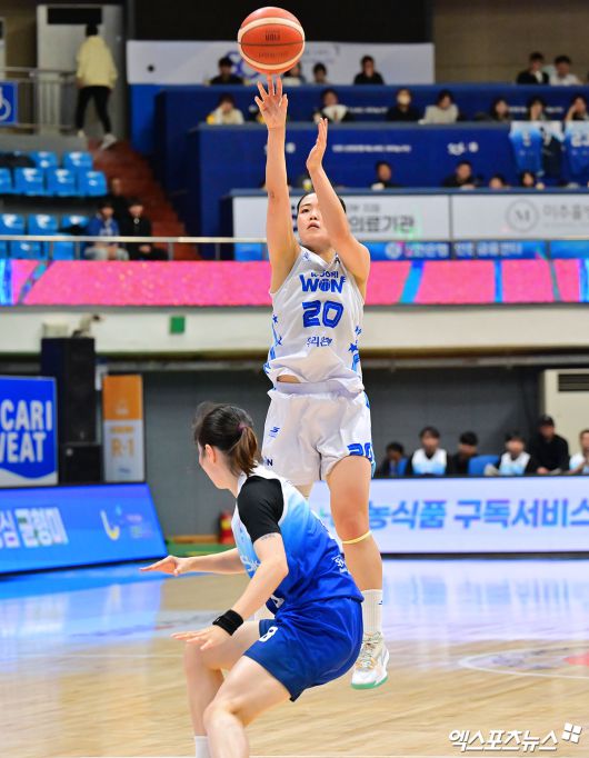 (엑스포츠뉴스 인천, 김한준 기자) 12일 오후 인천광역시 중구 도원체육관에서 열린 'BNK 금융 2025-2026 여자프로농구' 신한은행과 우리은행의 경기, 우리은행 이명관이 3점슛을 시도하고 있다.김한준 기자 kowel@xportsnews.com