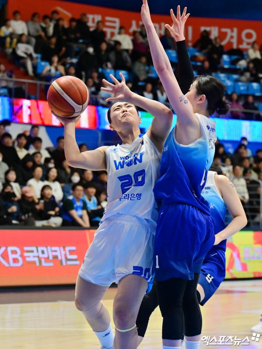 (엑스포츠뉴스 인천, 김한준 기자) 12일 오후 인천광역시 중구 도원체육관에서 열린 'BNK 금융 2025-2026 여자프로농구' 신한은행과 우리은행의 경기, 우리은행 이명관이 골밑슛을 시도하고 있다.김한준 기자 kowel@xportsnews.com