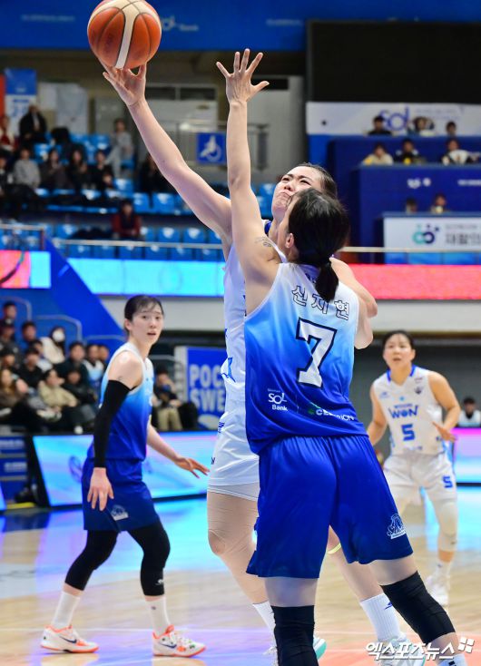 (엑스포츠뉴스 인천, 김한준 기자) 12일 오후 인천광역시 중구 도원체육관에서 열린 'BNK 금융 2025-2026 여자프로농구' 신한은행과 우리은행의 경기, 우리은행 이명관이 레이업을 시도하고 있다.