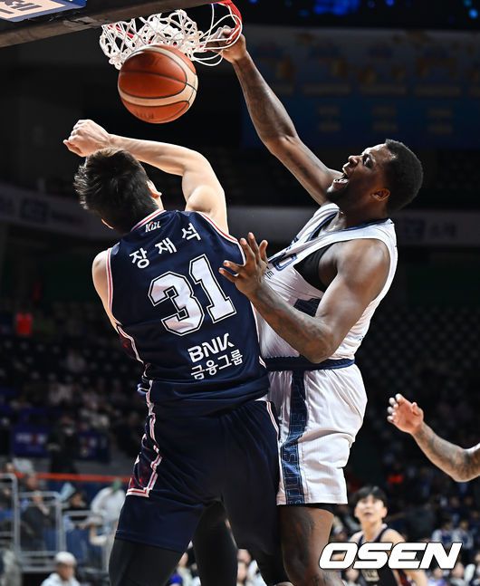 고양 소노 제일린 존슨이 부산 KCC 장재석의 마크를 뚫고 덩크슛을 성공시키고 있다. 2026.01.12 / foto0307@osen.co.kr