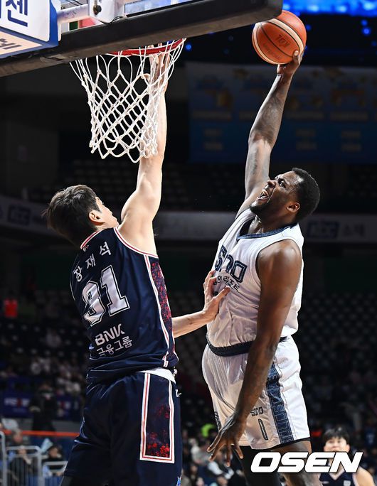 고양 소노 제일린 존슨이 부산 KCC 장재석의 마크를 뚫고 덩크슛을 성공시키고 있다. 2026.01.12 / foto0307@osen.co.kr