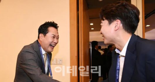 작년 서울 중구 대한상공회의소에서 열린 ‘문화미래리포트(MFR) 2025 트러피즘 향방과 대한민국의 선택’ 국제 포럼에서 장동혁(왼쪽) 국민의힘 대표와 이준석 개혁신당 대표가 인사를 나누고 있다. (사진=뉴스1) |