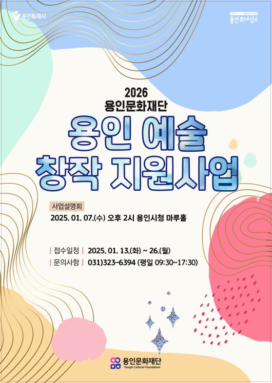 [헤럴드경제(용인)=박정규 기자]용인문화재단(이사장 이상일)은 기존‘문화 예술 공모 지원사업’을 전면 개편하고, 사업명을 ‘2026 용인 예술 창작 지원’으로 변경해 새롭게 전환한다고 밝혔다. 이번 사업은 지난 6일 공고됐으며, 1월 13일부터 26일까지 접수를 통해 총 6억 400만 원의 지원금을 사업 유형과 규모에 따라 차등 지원할 예정이다.