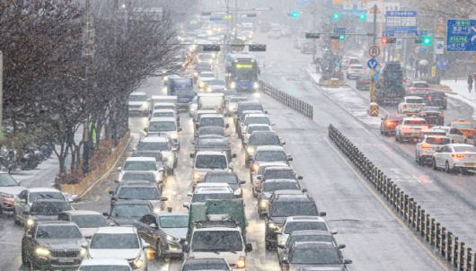 눈이 내리는 12일 서울 마포구 인근 도로가 정체되고 있다.(사진=뉴스1) |
