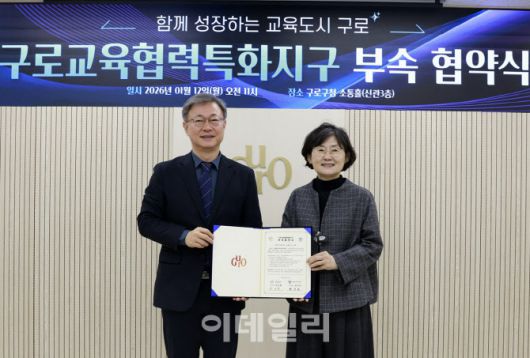 [이데일리 김태형 기자] 장인홍(왼쪽) 구로구청장과 한미라 서울특별시남부교육지원청 교육장이 12일 구로구청 소통홀에서 ‘구로교육협력특화지구 부속 합의 협약식’을 체결하고 있다.