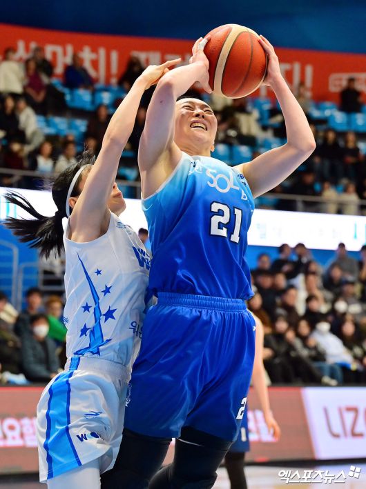 (엑스포츠뉴스 인천, 김한준 기자) 12일 오후 인천광역시 중구 도원체육관에서 열린 'BNK 금융 2025-2026 여자프로농구' 신한은행과 우리은행의 경기, 신한은행 김진영이 골밑슛을 시도하고 있다.김한준 기자 kowel@xportsnews.com