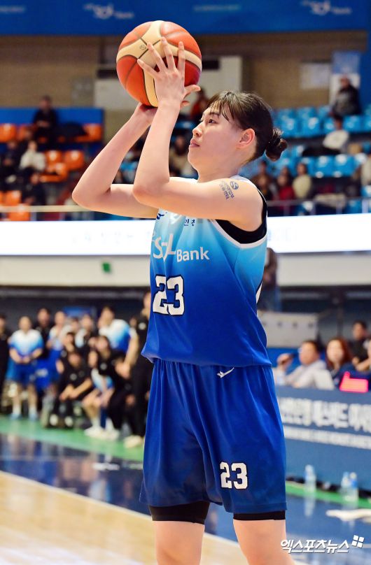 (엑스포츠뉴스 인천, 김한준 기자) 12일 오후 인천광역시 중구 도원체육관에서 열린 'BNK 금융 2025-2026 여자프로농구' 신한은행과 우리은행의 경기, 신한은행 홍유순이 점프슛을 시도하고 있다.김한준 기자 kowel@xportsnews.com