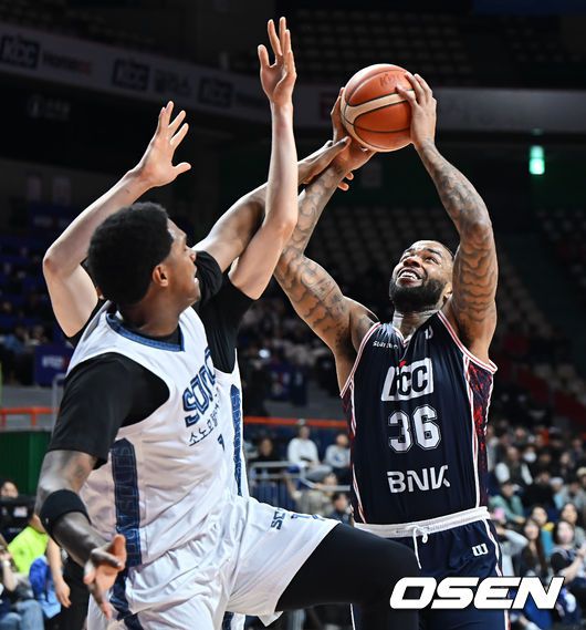 부산 KCC 숀롱이 고양 소노 강지훈, 나이트의 마크를 피해 골밑슛을 시도하고 있다. 2026.01.12 / foto0307@osen.co.kr