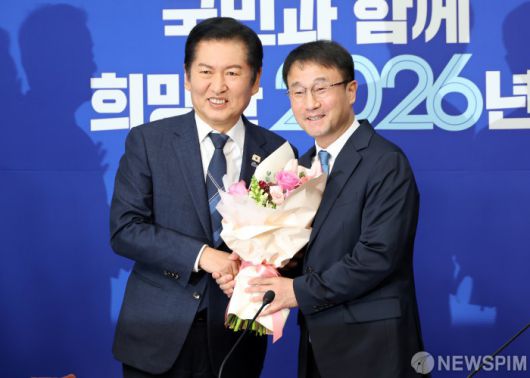[서울=뉴스핌] 정일구 기자 = 정청래 더불어민주당 대표가 12일 오전 서울 여의도 국회에서 열린 최고위원회의에서 한병도 신임 원내대표에게 축하 꽃다발을 전달한 뒤 기념촬영을 하고 있다. 2026.01.12 mironj19@newspim.com |