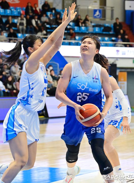 (엑스포츠뉴스 인천, 김한준 기자) 12일 오후 인천광역시 중구 도원체육관에서 열린 'BNK 금융 2025-2026 여자프로농구' 신한은행과 우리은행의 경기, 신한은행 미마 루이가 골밑슛을 시도하고 있다.김한준 기자 kowel@xportsnews.com