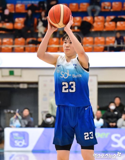 (엑스포츠뉴스 인천, 김한준 기자) 12일 오후 인천광역시 중구 도원체육관에서 열린 'BNK 금융 2025-2026 여자프로농구' 신한은행과 우리은행의 경기, 신한은행 홍유순이 3점슛을 시도하고 있다.김한준 기자 kowel@xportsnews.com