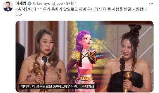 이 대통령은 12일 본인의 엑스(X·옛 트위터)에 케데헌의 2관왕 소식이 담긴 기사 링크와 함께 “축하한다. 우리 문화가 앞으로도 세계 무대에서 더 큰 사랑을 받길 기원한다”고 언급했다.