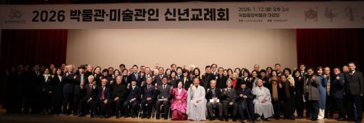 [서울=뉴시스] 김근수 기자 = 최휘영 문화체육관광부 장관이 12일 서울 용산구 국립중앙박물관 대강당에서 열린 ‘2026 박물관·미술관인 신년교례회'에서 참석자들과 기념촬영을 하고 있다. (사진= 문화체육관광부 제공) 2026.01.12. photo@newsis.com *재판매 및 DB 금지
