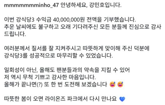 강민호는 SNS 계정을 통해 "안녕하세요, 강민호입니다. 이번 강식당3 수익금 40,000,000원 전액을 기부했습니다. 추운 날씨에도 불구하고 오래 기다려주신 모든 분들께 진심으로 감사드립니다. 여러분께서 질서를 잘 지켜주시고 따뜻하게 맞이해 주신 덕분에 강식당3를 성공적으로 마무리할 수 있었습니다"라고 전했다.