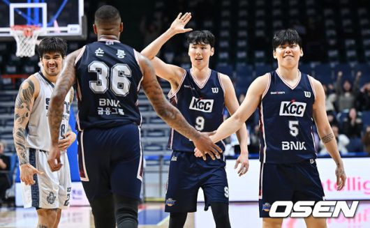 부산 KCC 송교창과 김동현이 4쿼터 막판 덩크슛을 성공시킨 숀롱과 기쁨을 나누고 있다. 2026.01.12 / foto0307@osen.co.kr