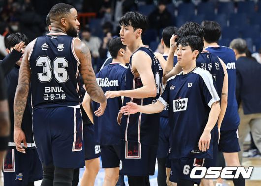 [OSEN=부산, 이석우 기자] 12일 부산 사직체육관에서 2025-2026 LG전자 프로농구 부산 KCC와 고양 소노의 경기가 열렸다. KCC가 소노에 96-90으로 승리했다. 부산 KCC 선수들이 6연패를 끊고 기쁨을 나누고 있다. 2026.01.12 / foto0307@osen.co.kr