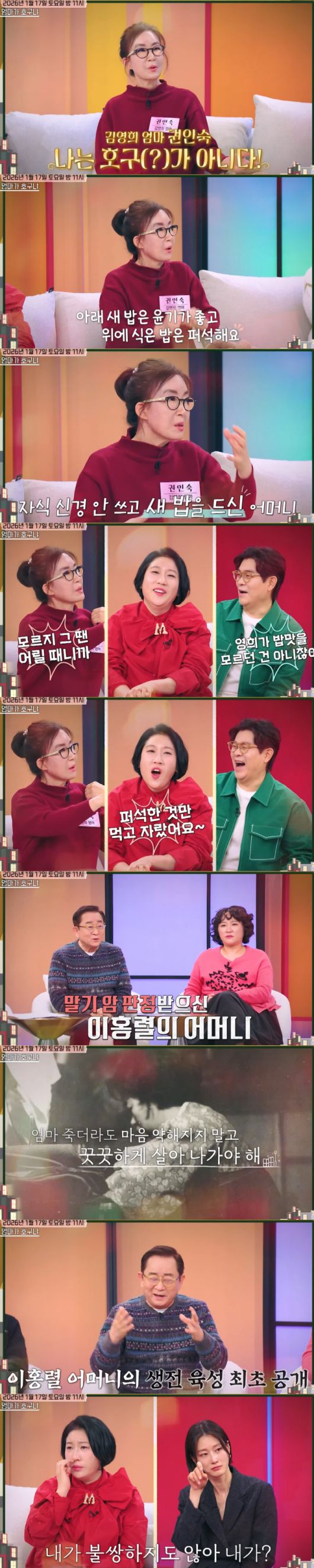 또한 이날 이홍렬은 말기 암 판정을 받으신 어머니를 떠올렸다. 이홍렬은 "어머니가 유언 같은 걸 많이 해주셨다"면서 '엄마 죽더라도 마음 약해지지 말고 꿋꿋하게 살아 나가야 해'라며 49세 어머니의 생전 육성을 최초 공개했다. 어머니의 이 같은 말에 이홍렬은 "내가 불쌍하지도 않아?"라며 눈물을 흘려 보는 이들까지 뭉클함을 안겼다.