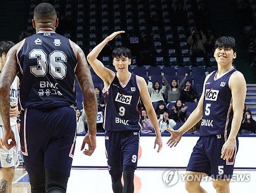 (부산=연합뉴스) 강선배 기자 = 12일 부산 사직실내체육관에서 열린 2025-2026 LG 전자 프로농구 정규리그 부산 KCC와 고양 소노의 경기. KCC 송교창과 김동현이 4쿼터 막판 덩크슛을 성공시킨 숀롱과 기쁨을 나누고 있다. 2026.1.12