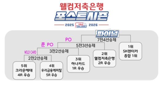 '웰컴저축은행 PBA 팀리그 2025-2026' 포스트시즌이 13일 오후 3시 고양 킨텍스 PBA 스타디움에서 우리금융캐피탈(종합 5위)과 크라운해태(종합 7위)의 와일드카드(WC) 결정전을 시작으로 열흘간의 대장정에 돌입한다.