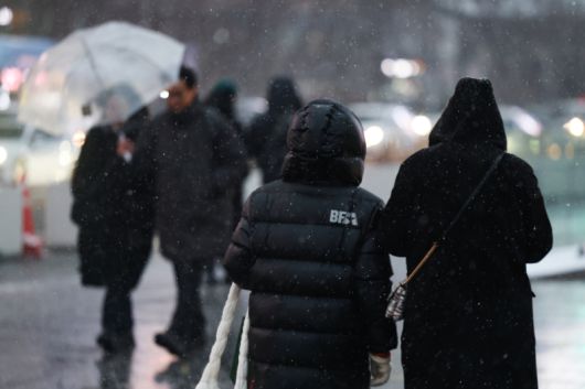 눈이 내린 12일 오후 서울 종로구 광화문광장 버스정류장에서 시민들이 외투 모자나 우산을 쓰고 이동하고 있다. 연합뉴스 |