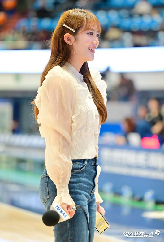 (엑스포츠뉴스 인천, 김한준 기자) 12일 오후 인천광역시 중구 도원체육관에서 열린 'BNK 금융 2025-2026 여자프로농구' 신한은행과 우리은행의 경기, 우리은행이 신한은행에 70:55로 승리했다. 최서임 아나운서가 리포팅을 하고 있다.김한준 기자 kowel@xportsnews.com