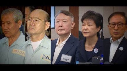 수용번호가 적힌 수의를 입은 두 전직 대통령이 나란히 서자 카메라 플래시가 연신 터집니다.