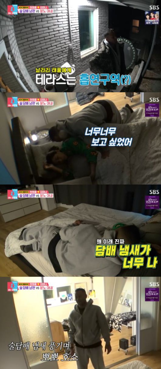 집에 도착하자마자 전태풍은 자신만의 공간이라면서 테라스로 향했다. 그리고 그 곳에서 담배를 피우기 시작했다. 담배를 다 피운 후 손도 씻지 않고 자고 있는 아내에게 향했다.