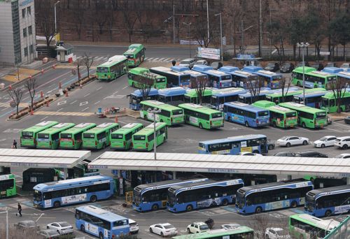 오는 13일로 예고된 서울시 시내버스 파업을 하루 앞둔 12일 서울의 한 버스공영차고지에 서울 시내 버스들이 주차되어 있다. 2026.1.12 [연합뉴스 제공] |