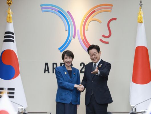 이재명 대통령과 다카이치 사나에 일본 총리가 지난해 10월 30일 서울 남동쪽 경주에서 열린 아시아태평양경제협력체(APEC) 정상회의를 계기로 양자 정상회담에 앞서 악수하고 있다./사진=뉴스1 |