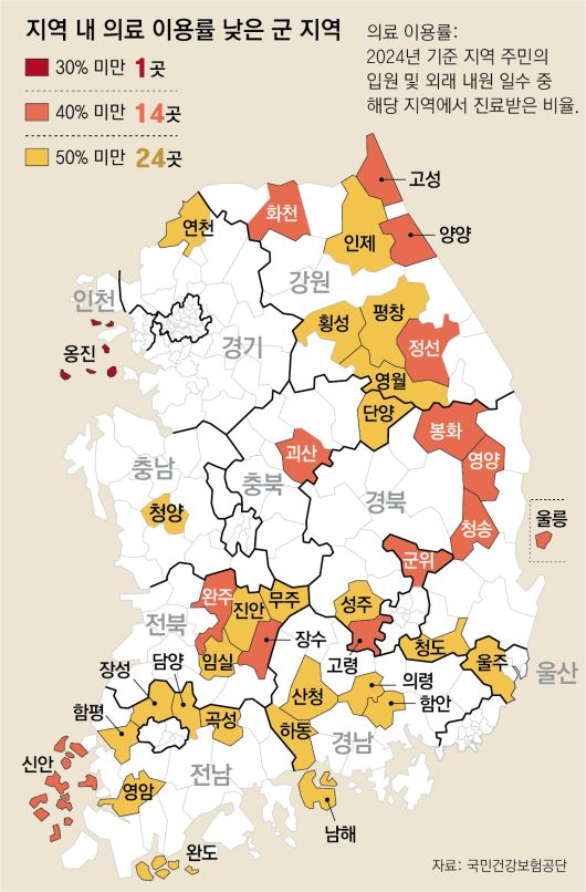 의사와 병원이 부족한 지방에서는 이처럼 ‘원정 진료’를 다니는 일이 다반사다. 12일 국민건강보험공단에 따르면 전국 군(郡) 지역 81곳 중 39곳(48.1%)은 인근 대도시나 수도권으로 원정 진료를 떠나는 비율이 50%가 넘는 것으로 집계됐다. 경북 영양군, 경남 산청군 등과 같이 지역 내에서 진료비를 20%도 쓰지 않는 곳이 14개나 됐다. 이는 2024년 시군구별 주민의 입원·외래 내원 일수와 진료비를 의료기관 소재지별로 분석한 결과다.