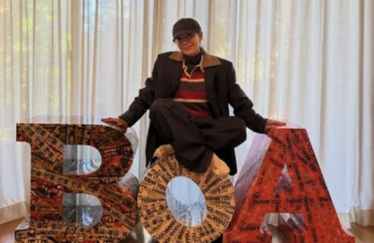 사진에는 보아가 자신의 이름 'BoA'로 제작된 대형 조형물 위에 앉아 미소짓고 있다.