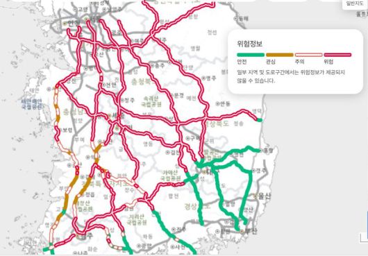 기상청 도로기상정보시스템 도로살얼음 발생가능정보. 12일 오후 11시 30분 기준으로 중부지방 대부분 도로가 위험을 의미하는 붉은색을 띄고 있다. |