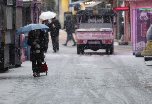 서울에 눈이 내린 12일 오후 서울 성북구 성신여대역 인근에서 시민들이 우산을 쓴채 이동하고 있다.(사진=연합뉴스) |