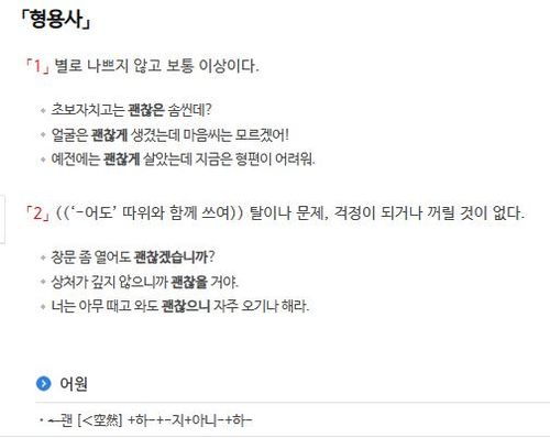 괜찮다는 별로 나쁘지 않고 보통 이상이라는 뜻의 형용사로 <괜('공연히'의 그 空然 뜻)+하+지+아니+하>의 조합이다. 문법서 해설을 따르면 괜찮지 않으냐 하는 게 제격일 수밖에 없다. 하지만 동생이 '괜찮지 않느냐'고 말했다고 쓴다 한들 그것을 틀렸다고 단정할 수 있을까. 게다가 동의를 구하거나 확인하는 투의 발화(發話)라면 단정하기가 더욱 어렵지 않을는지. 그러나, 그러나, 그럼에도 불구하고 어문 원칙은 위와 같다. 원칙이 있어야만 예외나 변칙을 설명할 길이 열리므로 그런 것인가?