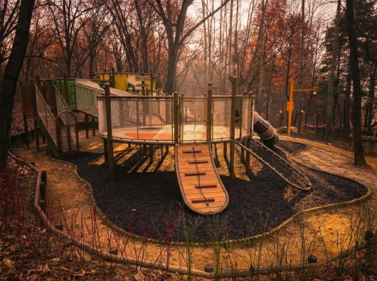▲대형 그물놀이대 ▲숲속 그네 ▲오두막 미끄럼틀 ▲숲속 모래 놀이터 등 다양한 놀이시설을 갖추어 유아는 물론 만 5세 이상 아이들도 함께 즐길 수 있는 숲속 놀이터로 재탄생했다.