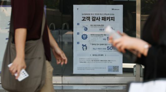 [서울=뉴스핌] 김학선 기자 = SK텔레콤이 지난 4월 발생한 해킹 사태 이후 약정 해지 가입자에 대한 위약금 면제를 결정한 가운데 8일 서울 시내의 한 SKT 매장에 '고객 감사 패키지' 안내가 붙어 있다. 2025.07.08 yooksa@newspim.com |
