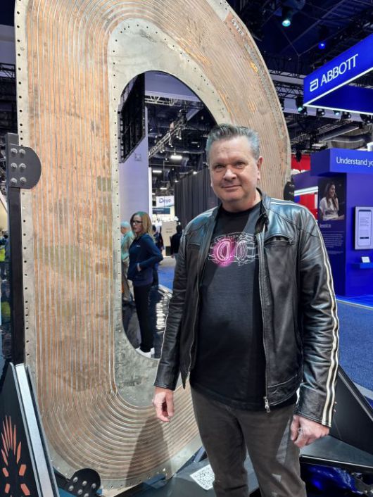 조 팔루스카 커먼웰스 퓨전 시스템(CFS) 최고마케팅책임자가 CES 2026에 전시된 고온초전체 자석 앞에서 포즈를 취하고 있다. 이 자석은 1억도의 온도에서 핵융합을 이끌어내 발전할 수 있는 기반이다. 사진=백종민 테크스페셜리스트 |