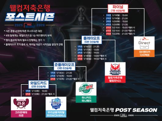 프로당구협회(PBA·총재 김영수)는 "13일부터 경기도 고양시 '고양 킨텍스 PBA 스타디움'에서 '웰컴저축은행 PBA 팀리그 2025-2026 포스트시즌'을 개최한다"고 밝혔다.