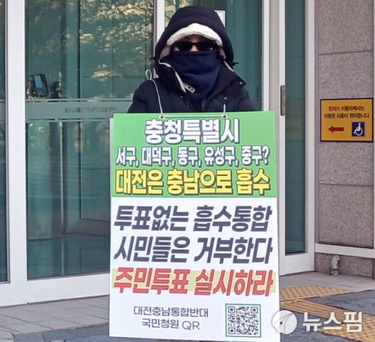 대전충남 행정통합 반대시민단체(가칭)은 13일 오전 9시부터 대전시청 북1문 앞에서 '충청특별시 추진 반대' 문구가 적힌 피켓을 들고 1인 시위를 벌이고 있다. 해당 피켓에는 "대전은 충남으로 흡수", "투표 없는 흡수통합 시민들은 거부한다", "주민투표 실시하라"는 문구가 적혀 있다.