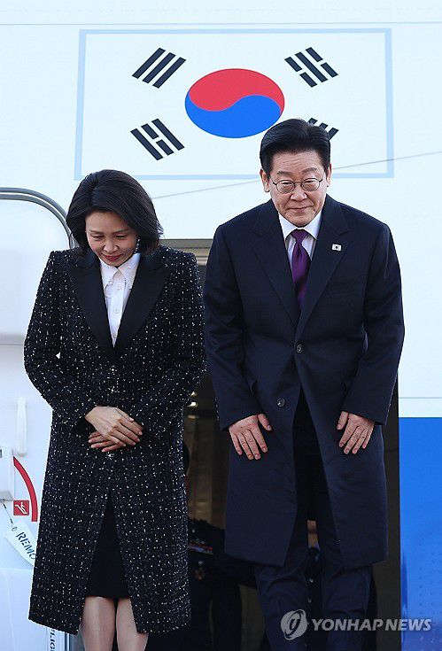(성남=연합뉴스) 김도훈 기자 = 한일 정상회담을 위해 일본 나라현을 방문하는 이재명 대통령과 김혜경 여사가 13일 성남 서울공항 공군 1호기에서 환송객에게 인사하고 있다. 2026.1.13