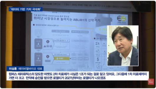 "컴퍼스 테라퓨틱스의 담도한 마켓도 2차 치료제가 사실은 1조가 되는 걸로 알고 있어요. 그다음에 1차 치료제까지 가면 더 크고 만약에 승인을 받으면 로열티가 2027년부터는 로열티가 나오겠죠. 001이 저희가 로열티를 받는 순간 에이비엘은 옛날과는 전혀 다른 진짜 다른 형태의 변형이 한번 일어나지 않을까 좋은 의미로..."