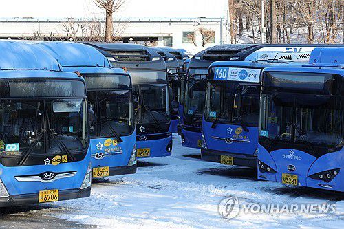 (서울=연합뉴스) 임병식 기자 = 서울 시내버스 노동조합이 파업에 돌입한 13일 오전 서울의 한 공영차고지에서 버스들이 주차되어 있다. 2026.1.13