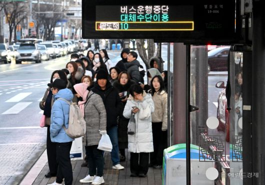 [헤럴드경제=임세준 기자] 서울 시내버스 노동조합이 전면파업에 돌입한 13일 오전 서울 영등포역 앞 버스정류장 전광판에 운행중단 안내문이 표시돼 있다.