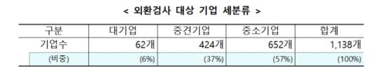 이에 관세청은 지난해 12월 일차적으로 불법적인 수출대금 미영수가 의심되는 35개 무역업체에 대한 특별단속에 이어 세관에 신고된 수출입금액과 은행을 통해 지급·수령된 무역대금 간의 편차가 크다고 보여지는 1138개 기업군을 대상으로 외환검사를 실시할 예정이라고 했다. 기업 규모별로는 대기업이 62곳(전체의 6%), 중견기업이 424곳(37%), 중소기업이 652곳(57%)이다.
