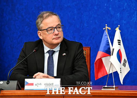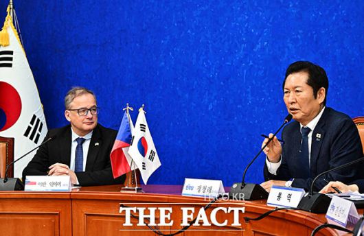 [더팩트ㅣ국회=배정한 기자] 정청래 더불어민주당 대표가 13일 오전 서울 여의도 국회에서 이반 얀차렉 주한체코대사(왼쪽)를 접견하며 기념사진 촬영을 하고 있다.