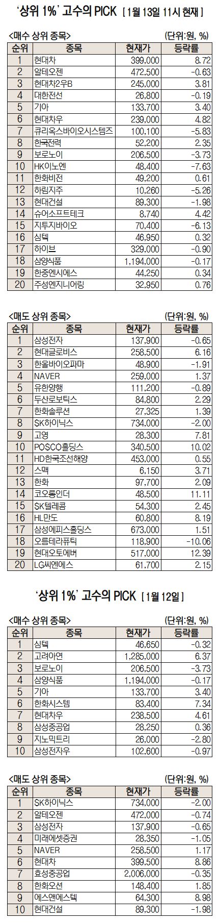 이날 미래에셋증권에 따르면 미래에셋증권 주식 거래 고객 중 최근 1개월간 투자 수익률 상위 1%에 해당하는 ‘주식 초고수’들이 오전 11시까지 가장 많이 사들인 종목은 현대차다.