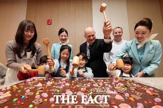 [더팩트ㅣ인천국제공항=남윤호 기자] 13일 인천국제공항 제2여객터미널 리뉴얼을 마친 대한항공 프레스티지 동편 좌측 라운지에서 데이비드 페이시 부사장(가운데)을 비롯한 관계자가 쿠킹 스튜디오 라이브러리에서 초콜릿을 부수고 있다.