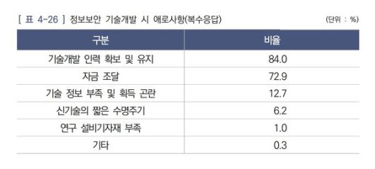 국내 보안기업들은 기술개발 인력 확보와 자금 조달에 가장 큰 어려움을 겪고 있는 것으로 나타났다. 업계에서는 결국 재원의 문제라며 산업의 구조적 개선을 요구하는 목소리가 나온다. /표=2025년 국내 정보보호산업 실태조사 보고서 |